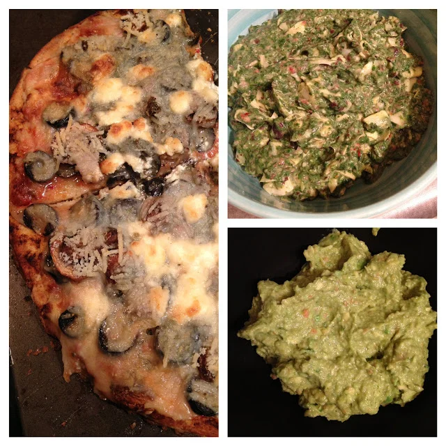 Super Bowl Superfoods: flatbread pizza w/organic mushrooms & olives; goat cheese, vegan mozzarella and homemade tomato sauce; homemade spinach artichoke dip; homemade guacamole