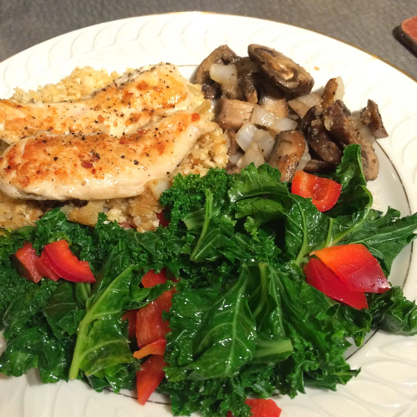 Garlic chicken on top of cauliflower rice, sauteed mushrooms & onions with a simple steamed kale & red pepper salad.
