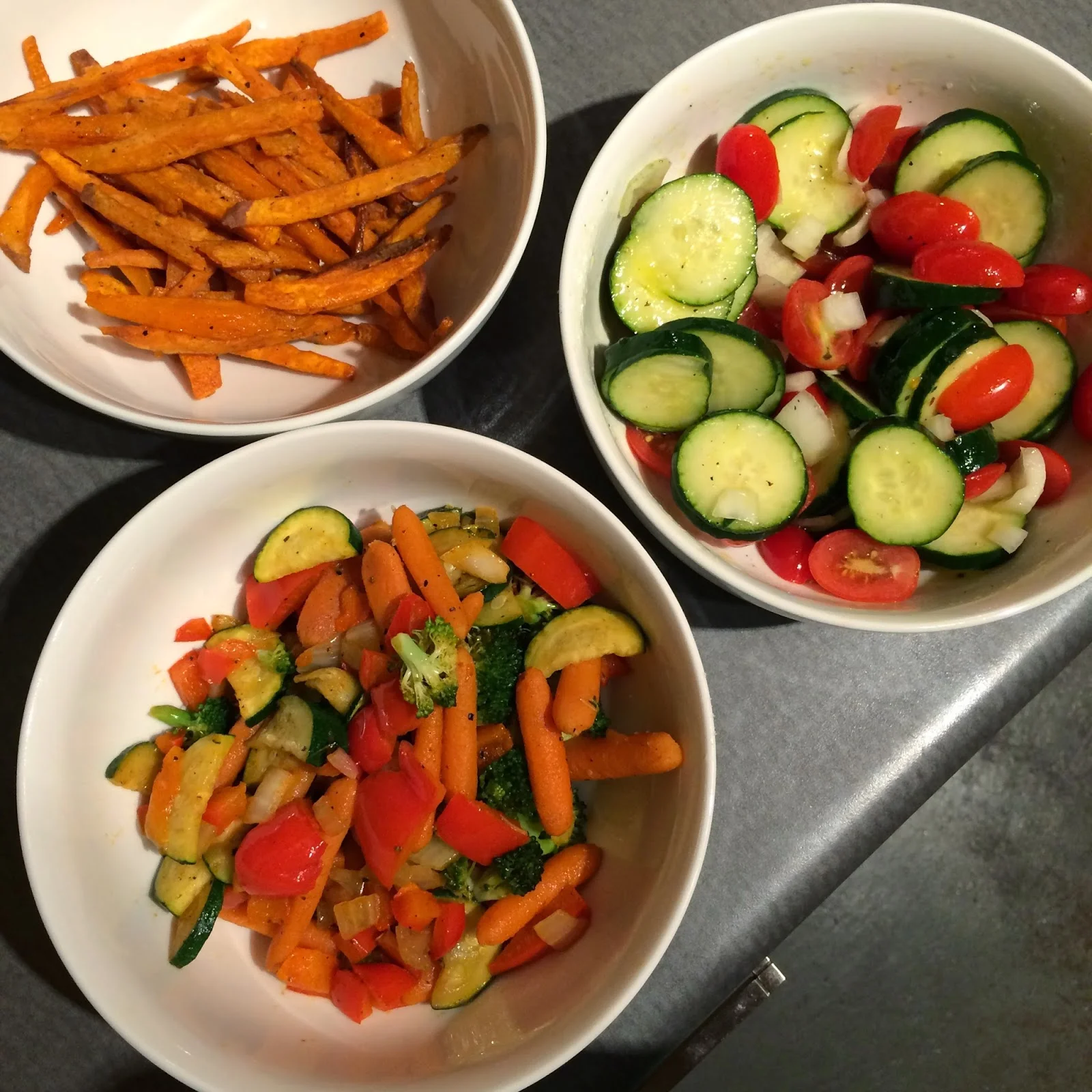 Homemade sweet potato fries, stir-fried veggies and Persian shirazi salad (thanks Natasha!)