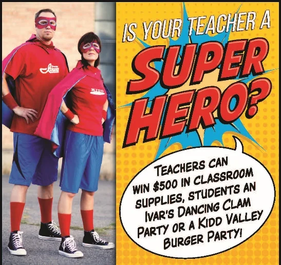 - K-8 students! Nominate your favorite teacher for Ivar's Teacher of the Year or Kidd Valley's Teacher of the Year! - through May 20